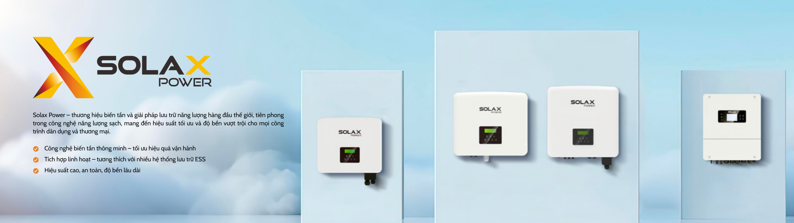 SolaX Power là thương hiệu hàng đầu thế giới trong lĩnh vực công nghệ biến tần, hệ thống lưu trữ năng lượng và giải pháp quản lý điện thông minh. Thành lập từ năm 2012 tại Hàng Châu (Trung Quốc), SolaX đã nhanh chóng mở rộng ra hơn 80 quốc gia, sở hữu trên 100 bằng sáng chế quốc tế và được niêm yết trên sàn STAR Thượng Hải năm 2024. Đạt hàng trăm chứng nhận quốc tế về chất lượng và an toàn, SolaX hiện nằm trong Top 2 toàn cầu về công nghệ biến tần và hệ thống lưu trữ năng lượng, khẳng định vị thế dẫn đầu ngành.