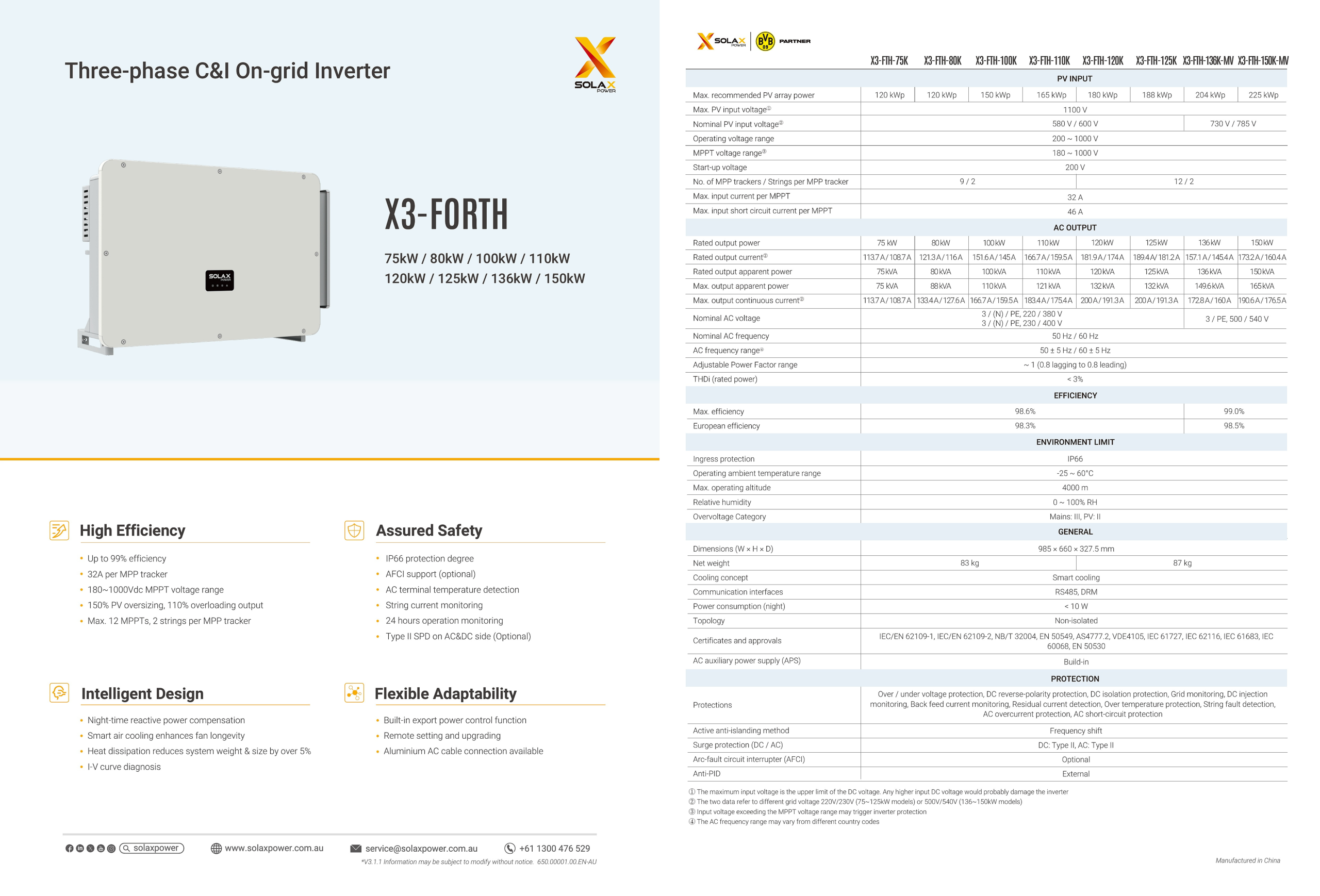 | Thông số kỹ thuật | SolaX X3 FORTH 99.9kW (3 pha hòa lưới) |