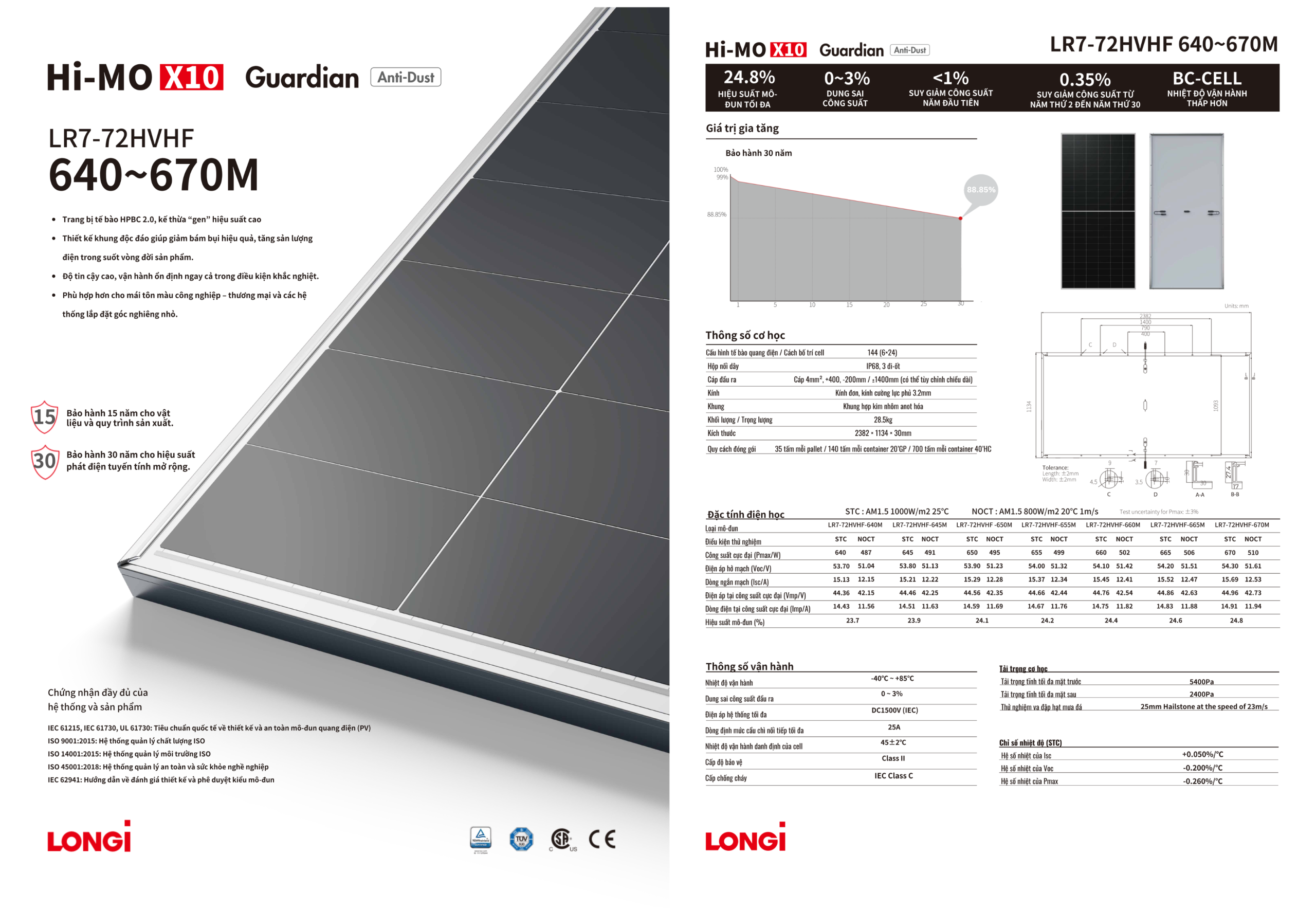 | Bảo hành hiệu suất | 30 năm (suy hao năm đầu <1%, từ năm 2–30 chỉ 0.35%/năm) |